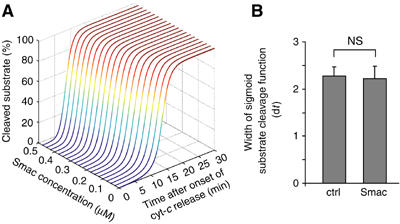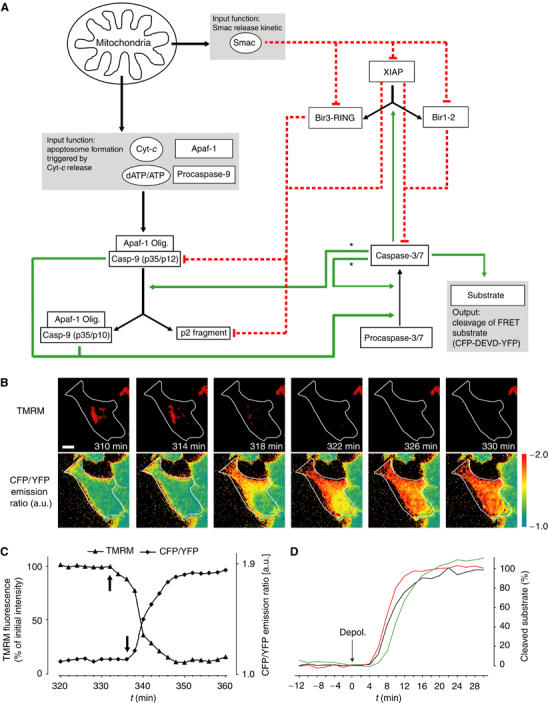 Activation of effector caspases is a final step during apoptosis. Single-cell imaging studies have demonstrated that this process may occur as a rapid, all-or-none response, triggering a complete substrate cleavage within 15 min. Based on biochemical data from HeLa cells, we have developed a computational model of apoptosome-dependent caspase activation that was sufficient to remodel the rapid kinetics of effector caspase activation observed in vivo. Sensitivity analyses predicted a critical role for caspase-3-dependent feedback signalling and the X-linked-inhibitor-of-apoptosis-protein (XIAP), but a less prominent role for the XIAP antagonist Smac. Single-cell experiments employing a caspase fluorescence resonance energy transfer substrate verified these model predictions qualitatively and quantitatively. XIAP was predicted to control this all-or-none response, with concentrations as high as 0.15 microM enabling, but concentrations >0.30 microM significantly blocking substrate cleavage. Overexpression of XIAP within these threshold concentrations produced cells showing slow effector caspase activation and submaximal substrate cleavage. Our study supports the hypothesis that high levels of XIAP control caspase activation and substrate cleavage, and may promote apoptosis resistance and sublethal caspase activation in vivo.