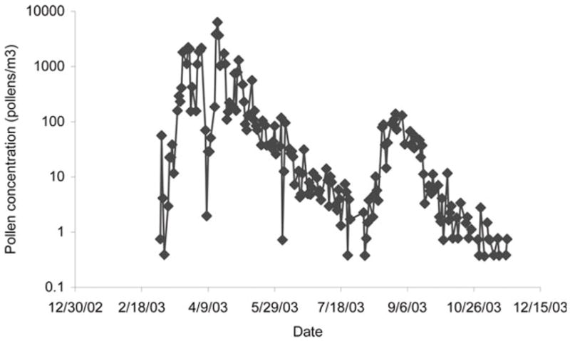 A time series model was fitted to the pollen concentration data collected in the Greater Cincinnati area for the Cincinnati Childhood Allergy and Air Pollution Study (CCAAPS). A traditional time series analysis and temporal variogram approach were applied to the regularly spaced databases (collected in 2003) and irregularly spaced ones (collected in 2002), respectively. The aim was to evaluate the effect of the sampling frequency on the sampling precision in terms of inverse of standard error of the overall level of mean value across time. The presence of high autocorrelation in the data was confirmed and indicated some degree of temporal redundancy in the pollen concentration data. Therefore, it was suggested that sampling frequency could be reduced from once a day to once every several days without a major loss of sampling precision of the overall mean over time. Considering the trade-offs between sampling frequency and the possibility of sampling bias increasing with larger sampling interval, we recommend that the sampling interval should take values from 3 to 5 days for the pollen monitoring program, if the goal is to track the long-term average.