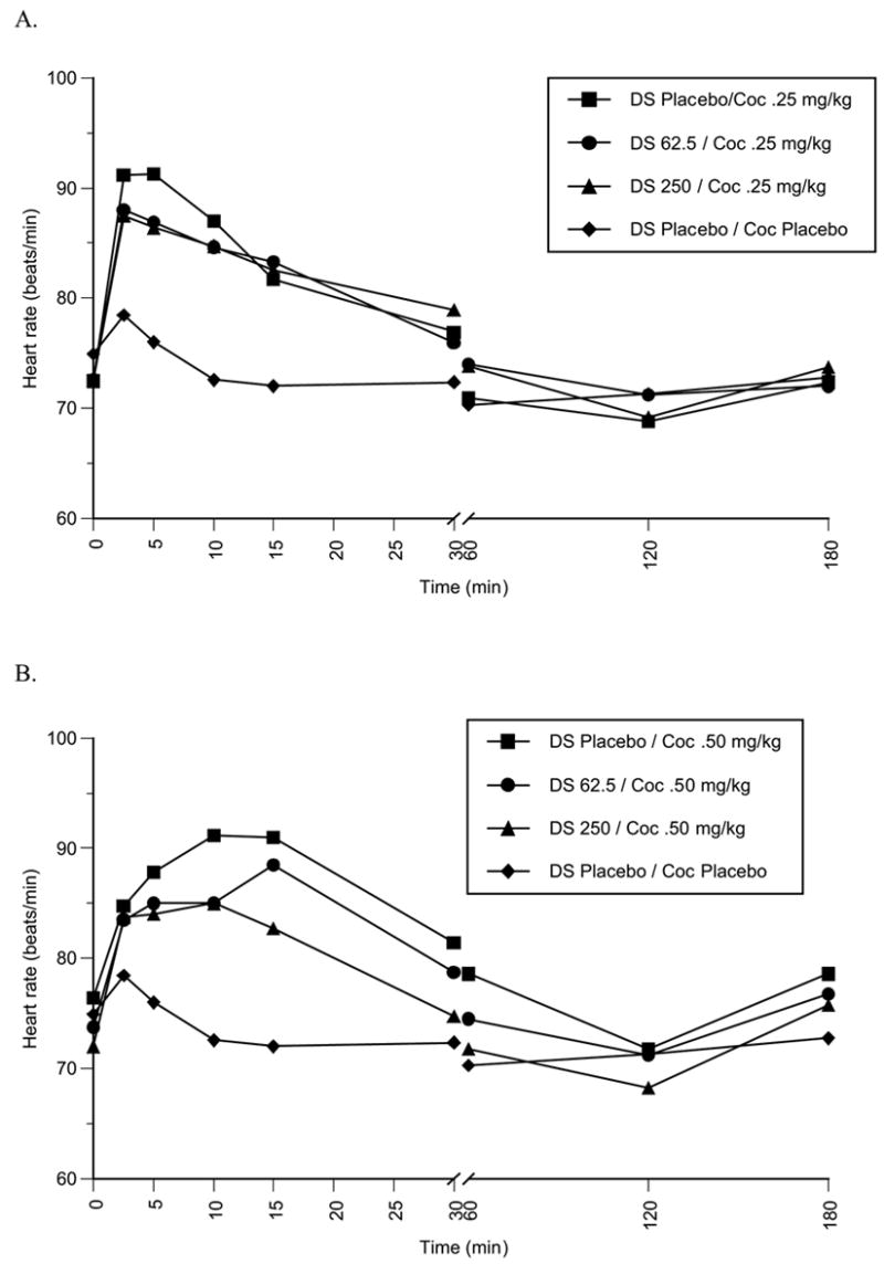 Results: Following active disulfiram treatments and cocaine 0.25 mg/kg administration, plasma cocaine AUC (0-480 min) was increased (p=0.003 and 0.001) and cocaine clearance decreased (p<0.001). Disulfiram treatments also decreased cocaine clearance for the 0.5 mg/kg cocaine dose (p=0.002 and<0.001). Neither disulfiram dose with cocaine altered cardiovascular responses relative to cocaine alone. Following cocaine 0.25 mg/kg, 'any high' (p=0.021 and 0.019), 'cocaine high' (p=0.017 and 0.018) and 'rush' (p=0.013 and 0.047) significantly decreased with either disulfiram dose.