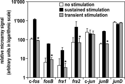 How cells convert the duration of signals into differential adaptation of gene expression is a poorly understood issue. Signal-induced immediate-early gene (IEG) expression couples early signals to late expression of downstream <target> genes. Here we study how kinetic features of the IEG-<target> system allow temporal integration of stimuli in a pancreatic beta cell model of metabolic stimulation. Gene expression profiling revealed that beta cells produce drastically different transcriptional outputs in response to different stimuli durations. Noteworthy, most genes (87%) regulated by a sustained stimulation (4 h) were not regulated by a transient stimulation (1 h followed by 3 h without stimulus). We analyzed the induction kinetics of several previously identified IEGs and <targets>. IEG expression persisted as long as stimulation was maintained, but was rapidly lost upon stimuli removal, abolishing the delayed <target> induction. The molecular mechanisms coupling the duration of stimuli to quantitative <target> transcription were demonstrated for the AP-1 transcription factor. In conclusion, we propose that the network composed of IEGs and their <targets> dynamically functions to convert signal inputs of different durations into quantitative differences in global transcriptional adaptation. These findings provide a novel and more comprehensive view of dynamic gene regulation.