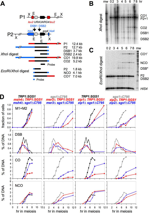 Sgs1, the budding yeast homolog of the mammalian BLM helicase, has been implicated in preventing excess recombination during both vegetative growth and meiosis. Most meiotic crossover (CO) recombination requires full function of a set of yeast proteins (Zip1, Zip2, Zip3, Zip4/Spo22, Mer3, Msh4, and Msh5, termed the SIC or ZMM proteins) that are also required for homologous chromosome synapsis. We report here genetic and molecular assays showing that sgs1 single mutants display relatively modest increases in CO recombination (less than 1.6-fold relative to wild-type). In contrast, a much greater CO increase is seen when an sgs1 mutation is introduced into the CO- and synapsis-deficient zip1, zip2, zip3, mer3, or msh4 mutants (2- to 8-fold increase). Furthermore, close juxtaposition of the axes of homologous chromosomes is restored. CO restoration in the mutants is not accompanied by significant changes in noncrossover (NCO) recombinant frequencies. These findings show that Sgs1 has potent meiotic anti-CO activity, which is normally antagonized by SIC/ZMM proteins. Our data reinforce previous proposals for an early separation of meiotic processes that form CO and NCO recombinants.