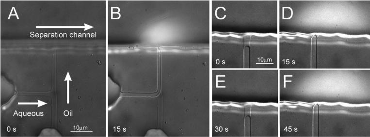 This paper demonstrates the ability to use capillary electrophoresis (CE) separation coupled with laser-induced fluorescence for analyzing the contents of single femtoliter-volume aqueous droplets. A single droplet was formed using a T-channel (3 microm wide by 3 microm tall) connected to microinjectors, and then the droplet was fluidically moved to an immiscible boundary that isolates the CE channel (50 microm wide by 50 microm tall) from the droplet generation region. Fusion of the aqueous droplet with the immiscible boundary effectively injects the droplet content into the separation channel. In addition to injecting the contents of droplets, we found aqueous samples can be introduced directly into the separation channel by reversibly penetrating and resealing the immiscible partition. Because droplet generation in channels requires hydrophobic surfaces, we have also investigated the advantages to using all hydrophobic channels versus channel systems with patterned hydrophobic and hydrophilic regions. To fabricate devices with patterned surface chemistry, we have developed a simple strategy based on differential wetting to deposit selectively a hydrophilic polymer (poly(styrenesulfonate)) onto desired regions of the microfluidic chip. Finally, we applied our device to the separation of a simple mixture of fluorescein-labeled amino acids contained within a approximately 10-fL droplet.