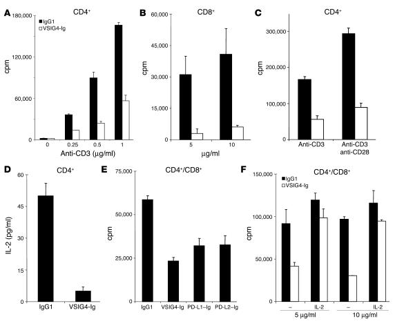 T cell activation by APCs is positively and negatively regulated by members of the B7 family. We have identified a previously unknown function for B7 family-related protein V-set and Ig domain-containing 4 (VSIG4). In vitro experiments using VSIG4-Ig fusion molecules showed that VSIG4 is a strong negative regulator of murine and human T cell proliferation and IL-2 production. Administration to mice of soluble VSIG4-Ig fusion molecules reduced the induction of T cell responses in vivo and inhibited the production of Th cell-dependent IgG responses. Unlike that of B7 family members, surface expression of VSIG4 was restricted to resting tissue macrophages and absent upon activation by LPS or in autoimmune inflammatory foci. The specific expression of VSIG4 on resting macrophages in tissue suggests that this inhibitory ligand may be important for the maintenance of T cell unresponsiveness in healthy tissues.