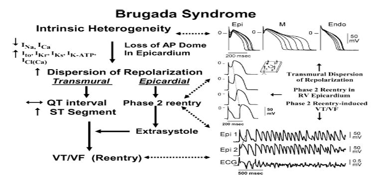 First introduced as a new clinical entity in 1992, the Brugada syndrome is associated with a relatively high risk of sudden death in young adults, and occasionally in children and infants. Recent years have witnessed a striking proliferation of papers dealing with the clinical and basic aspects of the disease. Characterized by a coved-type ST-segment elevation in the right precordial leads of the electrocardiogram (ECG), the Brugada syndrome has a genetic basis that thus far has been linked only to mutations in SCN5A, the gene that encodes the alpha-subunit of the sodium channel. The Brugada ECG is often concealed, but can be unmasked or modulated by a number of drugs and pathophysiological states including sodium channel blockers, a febrile state, vagotonic agents, tricyclic antidepressants, as well as cocaine and propranolol intoxication. Average age at the time of initial diagnosis or sudden death is 40 +/- 22, with the youngest patient diagnosed at 2 days of age and the oldest at 84 years. This review provides an overview of the clinical, genetic, molecular, and cellular aspects of the Brugada syndrome, incorporating the results of two recent consensus conferences. Controversies with regard to risk stratification and newly proposed pharmacologic strategies are discussed.