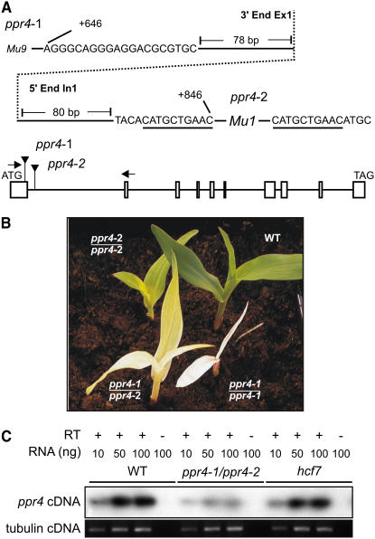 The pentatricopeptide repeat (PPR) is a degenerate 35-amino acid repeat motif that is widely distributed among eukaryotes. Genetic, biochemical, and bioinformatic data suggest that many PPR proteins influence specific posttranscriptional steps in mitochondrial or chloroplast gene expression and that they may typically bind RNA. However, biological functions have been determined for only a few PPR proteins, and with few exceptions, substrate RNAs are unknown. To gain insight into the functions and substrates of the PPR protein family, we characterized the maize (Zea mays) nuclear gene ppr4, which encodes a chloroplast-targeted protein harboring both a PPR tract and an RNA recognition motif. Microarray analysis of RNA that coimmunoprecipitates with PPR4 showed that PPR4 is associated in vivo with the first intron of the plastid rps12 pre-mRNA, a group II intron that is transcribed in segments and spliced in trans. ppr4 mutants were recovered through a reverse-genetic screen and shown to be defective for rps12 trans-splicing. The observations that PPR4 is associated in vivo with rps12-intron 1 and that it is also required for its splicing demonstrate that PPR4 is an rps12 trans-splicing factor. These findings add trans-splicing to the list of RNA-related functions associated with PPR proteins and suggest that plastid group II trans-splicing is performed by different machineries in vascular plants and algae.