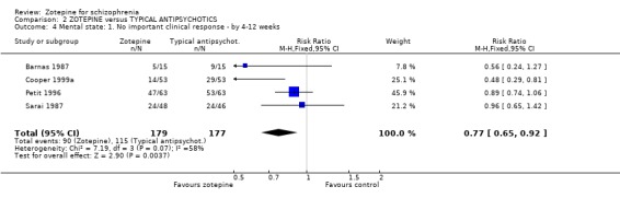 Main results: The review currently includes 11 studies with 966 participants. Most outcomes were short term (4-12 weeks). We found no data for outcomes such as relapse, time in hospital, satisfaction with care and day-to-day functioning. Compared with placebo, mental state ratings favoured zotepine (n=106, 1 RCT, RR No 20% decrease in BPRS 0.44 CI 0.3 to 0.7, NNT 3 CI 2 to 6) using the last observation carried forward method. For the comparison with typical drugs, limited data suggest that zotepine may be as effective as these older medications. Mental state measures of 'no clinically important improvement' favour zotepine when compared with other active drugs (n=356, 4 RCTs, RR 0.77 CI 0.7 to 0.9, NNT 7 CI 4 to 22). About one third of people in both the zotepine and control groups left the studies before trial completion. Zotepine may result in less movement disorder adverse effects than typical antipsychotic drugs. Trials have not highlighted clear differences between zotepine and other atypical drugs.