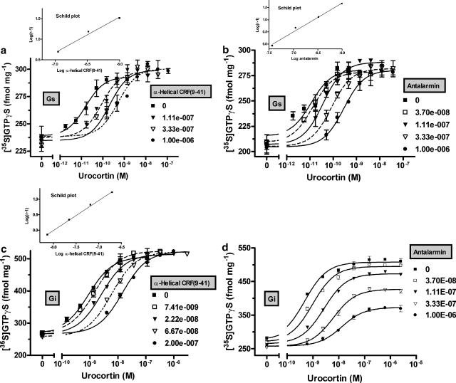 Key results: The non-peptide antagonized the receptor coupling to Gs competitively but that to Gi noncompetitively, and its antagonistic potency was different for urocortin- and sauvagine-evoked G-protein activation. In contrast, the peptide antagonist exhibited uniformly competitive antagonism.
