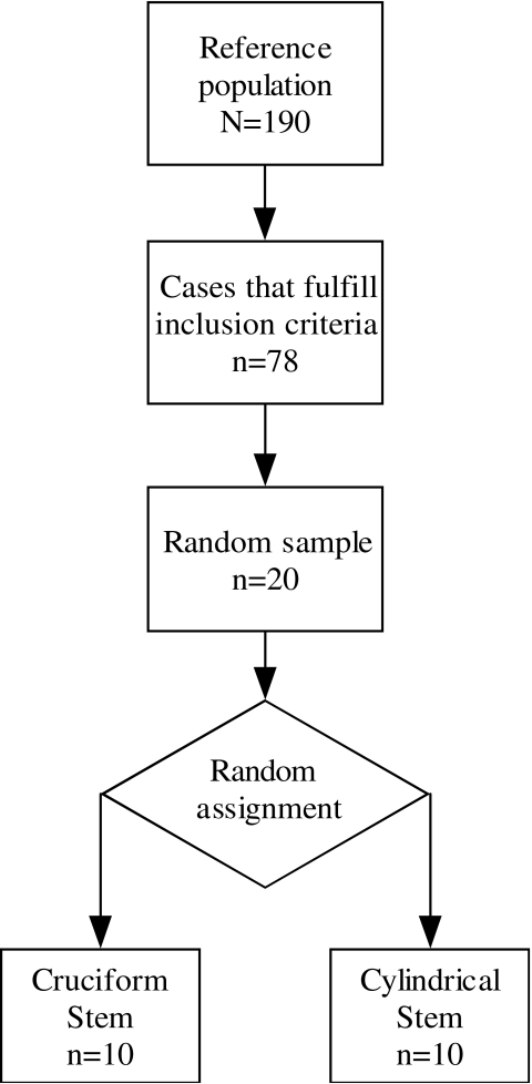 We prospectively measured the changes in bone mineral density (BMD) in the proximal tibia of 20 total knee arthroplasties, ten with cruciform stems and ten with cylindrical stems. The measurements were made one, four and seven years after surgery. We observed a uniform density decrease in three regions of interest from one to seven years of follow-up. Cylindrical stems showed an asymmetrical density decrease between the three regions of interest, with no change in the central region, a slight decrease in the lateral region, and large decrease in the medial region. Multivariate analysis with general linear model showed the stem type factor as statistically significant for medial region of interest (p = 0.006). The cylindrical stem produces heterogeneous BMD changes under the tibial platform in knee arthroplasties, and this could be a potential risk factor for asymmetrical subsidence of this component.