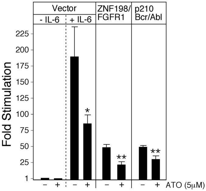 Results: Arsenic trioxide induced mitotic arrest starting at 24 hours and significant cell death at 48 hours. These events were preceded by an arsenic trioxide dose-dependent down-regulation of activated STAT proteins starting at 6 hours. We hypothesized that arsenic trioxide inhibits protein tyrosine kinases (PTK), which, among others, phosphorylate and activate STATs. We therefore studied arsenic trioxide effects on Janus kinases and on three oncogenic PTKs that are known to activate STATs [FLT3, ZNF198/fibroblast growth factor receptor 1 (FGFR1), and BCR/ABL]. Arsenic trioxide reduced STAT3 activation by Janus kinases, altered phosphorylation and electrophoretic mobility of ZNF198/fibroblast growth factor receptor 1, reduced kinase protein level, and decreased STAT3 protein phosphorylation. Arsenic trioxide also reduced the phosphorylation of BCR/ABL and FLT3 with corresponding decreased STAT5 phosphorylation.