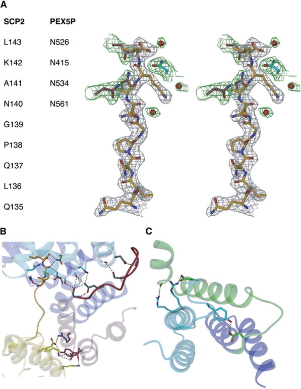 Peroxisomes require the translocation of folded and functional target proteins of various sizes across the peroxisomal membrane. We have investigated the structure and function of the principal import receptor Pex5p, which recognizes targets bearing a C-terminal peroxisomal targeting signal type 1. Crystal structures of the receptor in the presence and absence of a peroxisomal target, sterol carrier protein 2, reveal major structural changes from an open, snail-like conformation into a closed, circular conformation. These changes are caused by a long loop C terminal to the 7-fold tetratricopeptide repeat segments. Mutations in residues of this loop lead to defects in peroxisomal import in human fibroblasts. The structure of the receptor/cargo complex demonstrates that the primary receptor-binding site of the cargo is structurally and topologically autonomous, enabling the cargo to retain its native structure and function.
