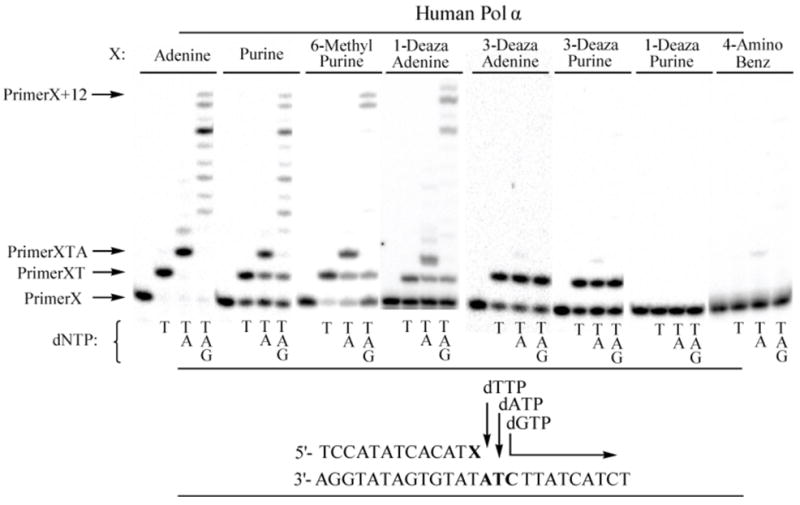 DNA polymerases accurately replicate DNA by incorporating mostly correct dNTPs opposite any given template base. We have identified the chemical features of purine dNTPs that human pol alpha uses to discriminate between right and wrong dNTPs. Removing N-3 from guanine and adenine, two high-fidelity bases, significantly lowers fidelity. Analogously, adding the equivalent of N-3 to low-fidelity benzimidazole-derived bases (i.e., bases that pol alpha rapidly incorporates opposite all four natural bases) and to generate 1-deazapurines significantly strengthens the ability of pol alpha to identify the resulting 1-deazapurines as wrong. Adding the equivalent of the purine N-1 to benzimidazole or to 1-deazapurines significantly decreases the rate at which pol alpha polymerizes the resulting bases opposite A, C, and G while simultaneously enhancing polymerization opposite T. Conversely, adding the equivalent of adenine's C-6 exocyclic amine (N-6) to 1- and 3-deazapurines also enhances polymerization opposite T but does not significantly decrease polymerization opposite A, C, and G. Importantly, if the newly inserted bases lack N-1 and N-6, pol alpha does not efficiently polymerize the next correct dNTP, whereas if it lacks N-3, one additional nucleotide is added and then chain termination ensues. These data indicate that pol alpha uses two orthogonal screens to maximize its fidelity. During dNTP polymerization, it uses a combination of negative (N-1 and N-3) and positive (N-1 and N-6) selectivity to differentiate between right and wrong dNTPs, while the shape of the base pair is essentially irrelevant. Then, to determine whether to add further dNTPs onto the just added nucleotide, pol alpha appears to monitor the shape of the base pair at the primer 3'-terminus. The biological implications of these results are discussed.