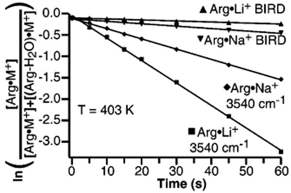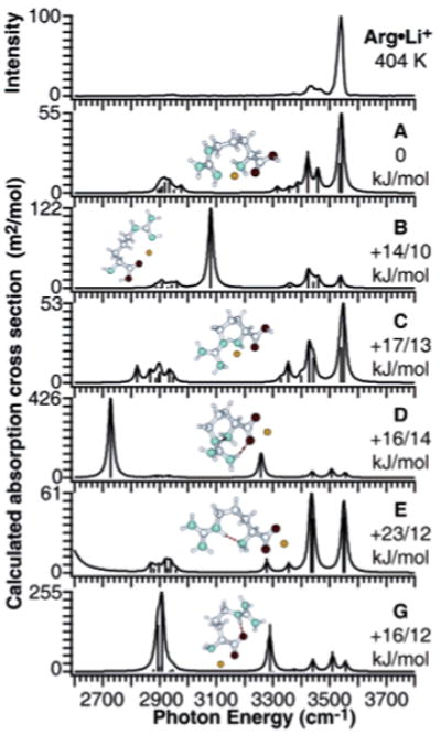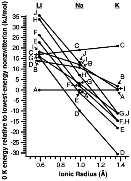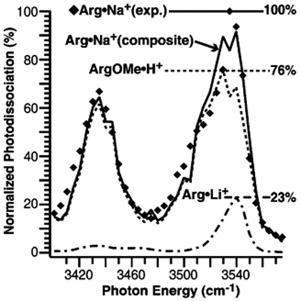 The gas-phase structures of protonated and alkali metal cationized arginine (Arg) and arginine methyl ester (ArgOMe) are investigated with infrared spectroscopy and ab initio calculations. Infrared spectra, measured in the hydrogen-stretch region, provide compelling evidence that arginine changes from its nonzwitterionic to zwitterionic form with increasing metal ion size, with the transition in structure occurring between lithium and sodium. For sodiated arginine, evidence for both forms is obtained from spectral deconvolution, although the zwitterionic form is predominant. Comparisons of the photodissociation spectra with spectra calculated for low-energy candidate structures provide additional insights into the detailed structures of these ions. Arg*Li+, ArgOMe*Li+, and ArgOMe*Na+ exist in nonzwitterionic forms in which the metal ion is tricoordinated with the amino acid, whereas Arg*Na+ and Arg*K+ predominately exist in a zwitterionic form where the protonated side chain donates one hydrogen bond to the N terminus of the amino acid and the metal ion is bicoordinated with the carboxylate group. Arg*H+ and ArgOMe*H+ have protonated side chains that form the same interaction with the N terminus as zwitterionic, alkali metal cationized arginine, yet both are unambiguously determined to be nonzwitterionic. Calculations indicate that for clusters with protonated side chains, structures with two strong hydrogen bonds are lowest in energy, in disagreement with these experimental results. This study provides new detailed structural assignments and interpretations of previously observed fragmentation patterns for these ions.