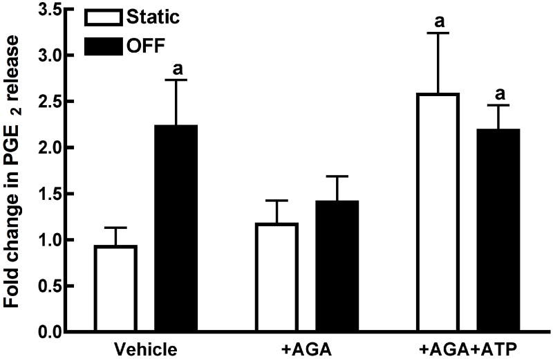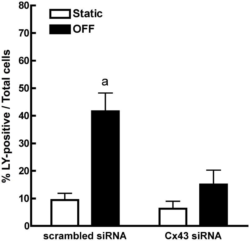 Mechanical loads are required for optimal bone mass. One mechanism whereby mechanical loads are transduced into localized cellular signals is strain-induced fluid flow through lacunae and canaliculi of bone. Gap junctions (GJs) between osteocytes and osteoblasts provides a mechanism whereby flow-induced signals are detected by osteocytes and transduced to osteoblasts. We have demonstrated the importance of GJ and gap junctional intercellular communication (GJIC) in intracellular calcium and prostaglandin E(2) (PGE(2)) increases in response to flow. Unapposed connexons, or hemichannels, are themselves functional and may constitute a novel mechanotransduction mechanism. Using MC3T3-E1 osteoblasts and MLO-Y4 osteocytes, we examined the time course and mechanism of hemichannel activation in response to fluid flow, the composition of the hemichannels, and the role of hemichannels in flow-induced ATP release. We demonstrate that fluid flow activates hemichannels in MLO-Y4, but not MC3T3-E1, through a mechanism involving protein kinase C, which induces ATP and PGE(2) release.