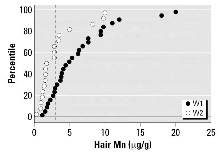 Results: Children whose houses were supplied by WI had higher hair Mn (MnH) than those supplied by W2 (mean 6.2+/-4.7 microg/g vs. 3.3+/-3.0 microg/g, p = 0.025). MnH was significantly associated with T-scores on the CTRS-R Oppositional (p = 0.020) and Hyperactivity (p = 0.002) subscales, after adjustment for age, sex, and income. All children with Oppositional and Hyperactivity T-scores > 65 had MnH > 3.0 microg/g.