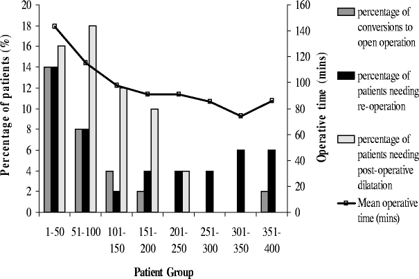 Many studies have looked at the learning curve associated with laparoscopic Nissen fundoplication (LNF) in a given institution. This study looks at the learning curve of a single surgeon with a large cohort of patients over a 10-year period. Prospective data were collected on 400 patients undergoing laparoscopic fundoplication for over 10 years. The patients were grouped consecutively into cohorts of 50 patients. The operating time, the length of postoperative hospital stay, the conversion rate to open operation, the postoperative dilatation rate, and the reoperation rate were analyzed. Results showed that the mean length of operative time decreased from 143 min in the first 50 patients to 86 min in the last 50 patients. The mean postoperative length of hospital stay decreased from 3.7 days initially to 1.2 days latterly. There was a 14% conversion to open operation rate in the first cohort compared with a 2% rate in the last cohort. Fourteen percent of patients required reoperation in the first cohort and 6% in the last cohort. Sixteen percent required postoperative dilatation in the first cohort. None of the last 150 patients required dilatation. In conclusion, laparoscopic fundoplication is a safe and effective operation for patients with gastroesophageal reflux disease. New techniques and better instrumentation were introduced in the early era of LNF. The learning curve, however, continues well beyond the first 20 patients.