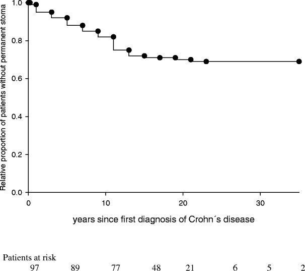 The purpose of the study was to determine the overall risk of a permanent stoma in patients with complicated perianal Crohn's disease, and to identify risk factors predicting stoma carriage. A total of 102 consecutive patients presented with the first manifestation of complicated perianal Crohn's disease in our outpatient department between 1992 and 1995. Ninety-seven patients (95%) could be followed up at a median of 16 years after first diagnosis of Crohn's disease. Patients were sent a standardized questionnaire and patient charts were reviewed with respect to the recurrence of perianal abscesses or fistulas and surgical treatment, including fecal diversion. Factors predictive of permanent stoma carriage were determined by univariate and multivariate analysis. Thirty of 97 patients (31%) with complicated perianal Crohn's disease eventually required a permanent stoma. The median time from first diagnosis of Crohn's disease to permanent fecal diversion was 8.5 years (range 0-23 years). Temporary fecal diversion became necessary in 51 of 97 patients (53%), but could be successfully removed in 24 of 51 patients (47%). Increased rates of permanent fecal diversion were observed in 54% of patients with complex perianal fistulas and in 54% of patients with rectovaginal fistulas, as well as in patients that had undergone subtotal colon resection (60%), left-sided colon resection (83%), or rectal resection (92%). An increased risk for permanent stoma carriage was identified by multivariate analysis for complex perianal fistulas (odds ratio [OR] 5; 95% confidence interval [CI] 2-18), temporary fecal diversion (OR 8; 95% CI 2-35), fecal incontinence (OR 21, 95% CI 3-165), or rectal resection (OR 30; 95% CI 3-179). Local drainage, setons, and temporary stoma for deep and complicated fistulas in Crohn's disease, followed by a rectal advancement flap, may result in closing of the stoma in 47% of the time. The risk of permanent fecal diversion was substantial in patients with complicated perianal Crohn's disease, with patients requiring a colorectal resection or suffering from fecal incontinence carrying a particularly high risk for permanent fecal diversion. In contrast, patients with perianal Crohn's disease who required surgery for small bowel disease or a segmental colon resection carried no risk of a permanent stoma.