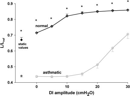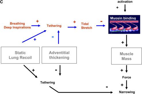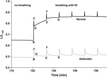 We quantified the effects of airway wall remodeling upon airway smooth muscle (ASM) shortening. Isolated ASM from sheep was attached to a servo-controller that applied a physiologic load. This load could be altered to reflect specified changes of airway wall geometry, elasticity, parenchymal tethering, transpulmonary pressure (P(L)), and fluctuations in P(L) associated with breathing. Starting at a reference length (L(ref)), ASM was stimulated with acetlycholine and held at constant P(L) of 4 cm H(2)O for 2 h. When all compartments were thickened to simulate the asthmatic airway but P(L) was held fixed, ASM shortened much more than that in the normal airway (to 0.52 L(ref) versus 0.66 L(ref)). When breathing with deep inspirations (DIs) was initiated, within the first three DIs the ASM in the normal airway lengthened to 0.84 L(ref), whereas that in the asthmatic airway remained stuck at 0.53 L(ref). Thickening of the smooth muscle layer alone produced the greatest muscle shortening (to 0.47 L(ref)) when compared with thickening of only submucosal (to 0.67 L(ref)) or only adventitial (to 0.62 L(ref)) compartments. With increased ASM mass, the ASM failed to lengthen in response to DIs, whereas in the airway with thickened submucosal and adventitial layers ASM lengthened dramatically (to 0.83 L(ref)). These findings confirm the long-held conclusion that increased muscle mass is the functionally dominant derangement, but mechanisms accounting for this conclusion differ dramatically from those previously presumed. Furthermore, increased ASM mass explained both hyperresponsiveness and the failure of a DI to relax the asthmatic airway.
