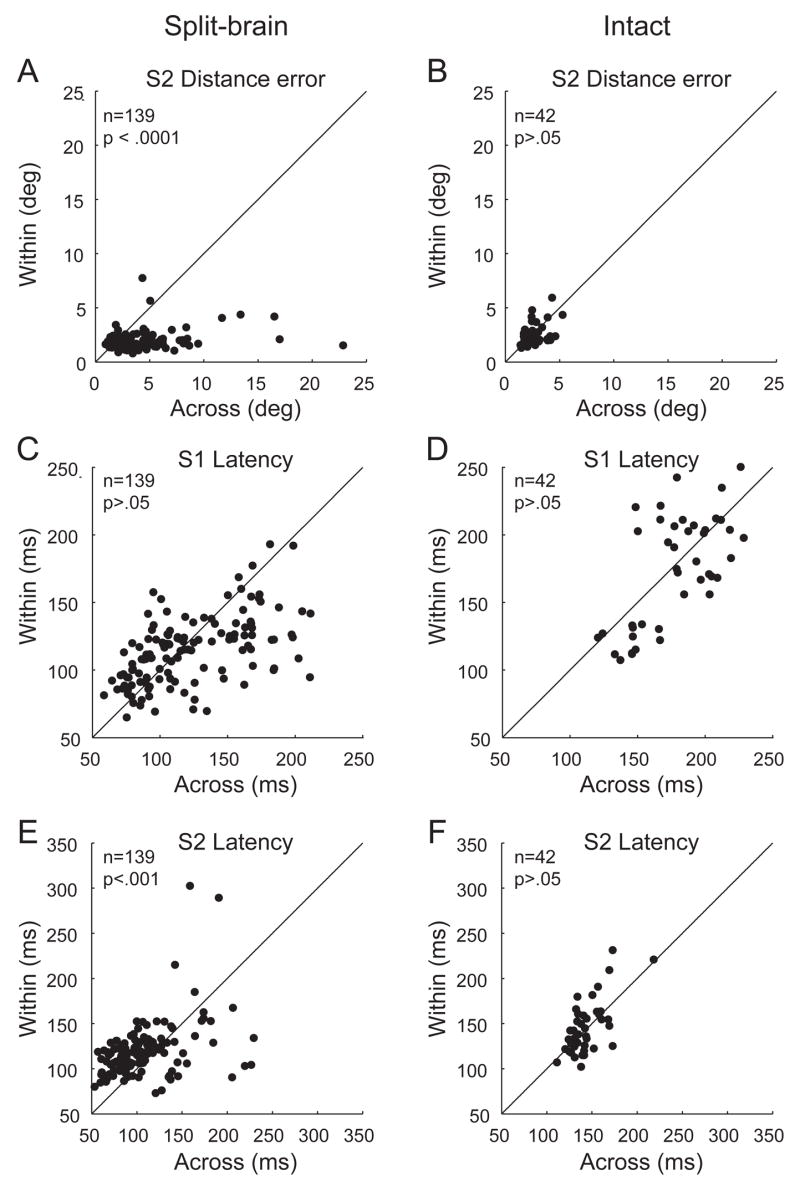 Each time the eyes move, the visual system must adjust internal representations to account for the accompanying shift in the retinal image. In the lateral intraparietal cortex (LIP), neurons update the spatial representations of salient stimuli when the eyes move. In previous experiments, we found that split-brain monkeys were impaired on double-step saccade sequences that required updating across visual hemifields, as compared to within hemifield. Here we describe a subsequent experiment to characterize the relationship between behavioral performance and neural activity in LIP in the split-brain monkey. We recorded from single LIP neurons while split-brain and intact monkeys performed two conditions of the double-step saccade task: one required across-hemifield updating and the other required within-hemifield updating. We found that, despite extensive experience with the task, the split-brain monkeys were significantly more accurate for within-hemifield than for across-hemifield sequences. In parallel, we found that population activity in LIP of the split-brain monkeys was significantly stronger for the within-hemifield than for the across-hemifield condition of the double-step task. In contrast, in the normal monkey, both the average behavioral performance and population activity showed no bias toward the within-hemifield condition. Finally, we found that the difference between within-hemifield and across-hemifield performance in the split-brain monkeys was reflected at the level of single-neuron activity in LIP. These findings indicate that remapping activity in area LIP is present in the split-brain monkey for the double-step task and covaries with spatial behavior on within-hemifield compared to across-hemifield sequences.