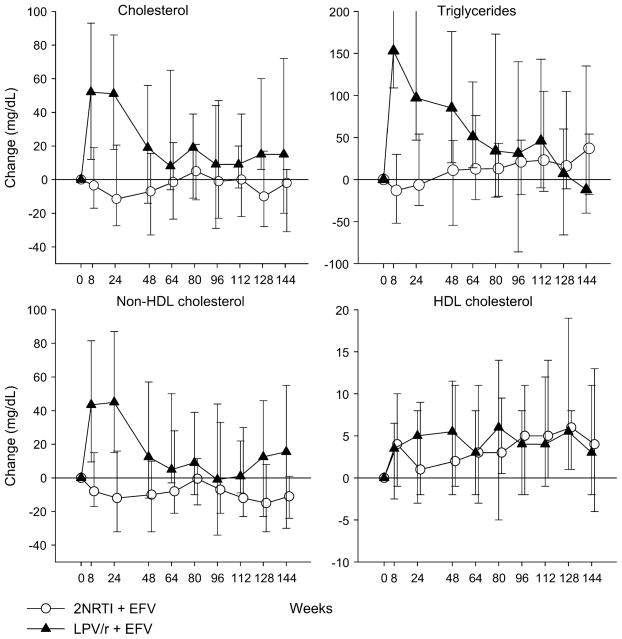 Switching to a protease inhibitor-containing, nucleoside-sparing regimen (lopinavir/ritonavir plus efavirenz) increases limb fat but raises serum lipid levels: results of a prospective randomized trial (AIDS clinical trial group 5125s)