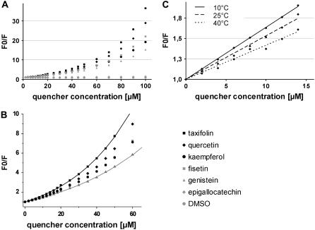 Based on the identification of actin as a target protein for the flavonol quercetin, the binding affinities of quercetin and structurally related flavonoids were determined by flavonoid-dependent quenching of tryptophan fluorescence from actin. Irrespective of differences in the hydroxyl pattern, similar Kd values in the 20 microM range were observed for six flavonoids encompassing members of the flavonol, isoflavone, flavanone, and flavane group. The potential biological relevance of the flavonoid/actin interaction in the cytoplasm and the nucleus was addressed using an actin polymerization and a transcription assay, respectively. In contrast to the similar binding affinities, the flavonoids exert distinct and partially opposing biological effects: although flavonols inhibit actin functions, the structurally related flavane epigallocatechin promotes actin activity in both test systems. Infrared spectroscopic evidence reveals flavonoid-specific conformational changes in actin which may mediate the different biological effects. Docking studies provide models of flavonoid binding to the known small molecule-binding sites in actin. Among these, the mostly hydrophobic tetramethylrhodamine-binding site is a prime candidate for flavonoid binding and rationalizes the high efficiency of quenching of the two closely located fluorescent tryptophans. The experimental and theoretical data consistently indicate the importance of hydrophobic, rather than H-bond-mediated, actin-flavonoid interactions. Depending on the rigidity of the flavonoid structures, different functionally relevant conformational changes are evoked through an induced fit.