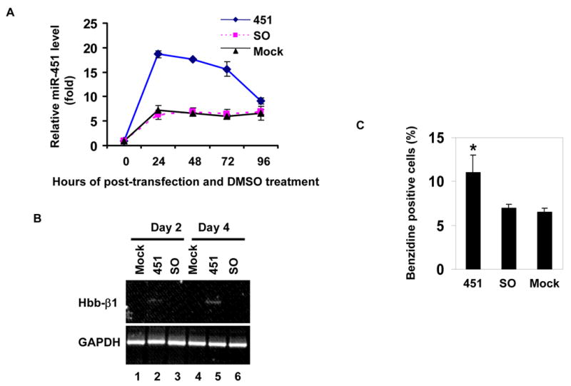 Results: More than 100 miRNAs were found to be expressed in erythroid cells. The majority of them showed changes in their expression levels with progression of erythroid differentiation. Further analysis revealed that overall miRNA expression levels are increased upon erythroid differentiation. Of the miRNAs analyzed, miR-451 was most significantly upregulated during erythroid maturation. Functional studies using gain of function and loss of function approaches showed that miR-451 is associated with erythroid maturation.