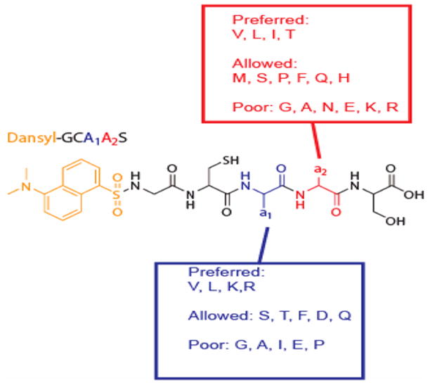 Farnesylation, catalyzed by protein farnesyltransferase (FTase), is an important post-translational modification guiding cellular localization. Recently predictive models for identifying FTase substrates have been reported. Here we evaluate these models through screening of dansylated-GCaaS peptides, which also provides new insights into the protein substrate selectivity of FTase.