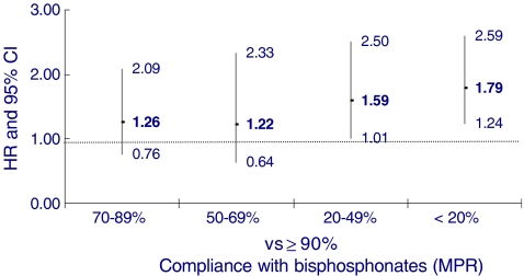 Methods: New female users of alendronate or risedronate between 1999-2004, aged >or=45 years were identified from PHARMO-RLS, including drug-dispensing and hospitalization data of >or= 2 million residents of the Netherlands. Patients were followed until first hospitalisation for an osteoporotic fracture, death, or end of study period. Compliance with bisphosphonates during follow-up was measured over 90-day intervals using Medication Possession Ratio (MPR). The association between compliance and fracture risk was analyzed using time-dependent Cox-regression.