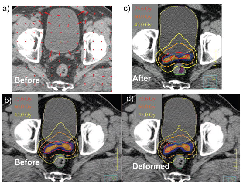 Materials and methods: In-room computed tomographic (CT) scans were acquired immediately before and after a daily treatment fraction in 46 patients with prostate cancer. An eight-field IMRT plan was designed using the pre-fraction CT with a 3-mm margin and subsequently recalculated on the post-fraction CT. For convenience of comparison, dose plans were scaled to full course of treatment (75.6 Gy). Dose coverage was assessed on the post-treatment CT image set.