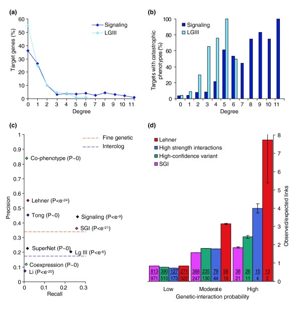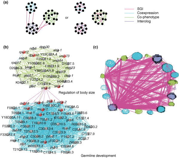 Results: We investigated interactions between 11 'query' mutants in conserved signal transduction pathways and hundreds of 'target' genes compromised by RNA interference (RNAi). Mutant-RNAi combinations that grew more slowly than controls were identified, and genetic interactions inferred through an unbiased global analysis of the interaction matrix. A network of 1,246 interactions was uncovered, establishing the largest metazoan genetic-interaction network to date. We refer to this approach as systematic genetic interaction analysis (SGI). To investigate how genetic interactions connect genes on a global scale, we superimposed the SGI network on existing networks of physical, genetic, phenotypic and coexpression interactions. We identified 56 putative functional modules within the superimposed network, one of which regulates fat accumulation and is coordinated by interactions with bar-1(ga80), which encodes a homolog of beta-catenin. We also discovered that SGI interactions link distinct subnetworks on a global scale. Finally, we showed that the properties of genetic networks are conserved between C. elegans and Saccharomyces cerevisiae, but that the connectivity of interactions within the current networks is not.