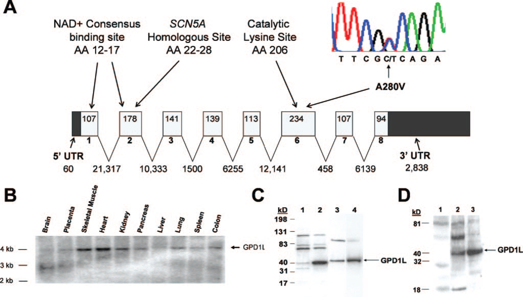 Methods and results: We used direct sequencing to identify a mutation (A280V) in a conserved amino acid of the glycerol-3-phosphate dehydrogenase 1-like (GPD1-L) gene. The mutation was present in all affected individuals and absent in >500 control subjects. GPD1-L RNA and protein are abundant in the heart. Compared with wild-type GPD1-L, coexpression of A280V GPD1-L with SCN5A in HEK cells reduced inward Na+ currents by approximately 50% (P<0.005). Wild-type GPD1-L localized near the cell surface to a greater extent than A280V GPD1-L. Coexpression of A280V GPD1-L with SCN5A reduced SCN5A cell surface expression by 31+/-5% (P=0.01).