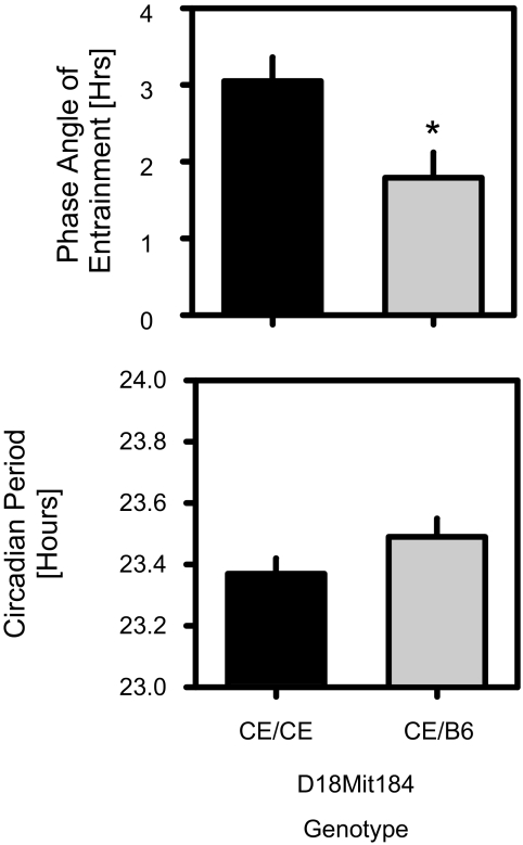 Study objective: The mammalian circadian clock in the suprachiasmatic nuclei (SCN) of the hypothalamus conveys 24-h rhythmicity to sleep-wake cycles, locomotor activity, and other behavioral and physiological processes. The timing of rhythms relative to the light/dark (LD12:12) cycle is influenced in part by the endogenous circadian period and the time of day specific sensitivity of the clock to light. We now describe a novel circadian rhythm phenotype, and a locus influencing that phenotype, in a segregating population of mice.