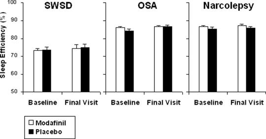 Results: Two hundred seventy-three patients with shift work sleep disorder, 292 with obstructive sleep apnea, and 369 with narcolepsy received modafinil; 567 received placebo. Modafinil was well tolerated versus placebo, with headache (34% vs 23%, respectively), nausea (11% vs 3%), and infection (10% vs 12%) the most common adverse events. Adverse events were similar across all patient groups. Twenty-seven serious adverse events were reported (modafinil, n = 18; placebo, n = 9). In modafinil-treated patients, clinically significant increases in diastolic or systolic blood pressure were infrequent (n = 9 and n = 1, respectively, < 1% of patients). In the studies, 1 patient in the modafinil group and 1 in the placebo group had a clinically significant increase in heart rate. New clinically meaningful electrocardiogram abnormalities were rare with modafinil (n = 2) and placebo (n = 4). Clinically significant abnormalities in mean laboratory parameters were observed in fewer than 1% of modafinil-treated patients at final visit. Modafinil did not affect sleep architecture in any patient population according to polysomnography.