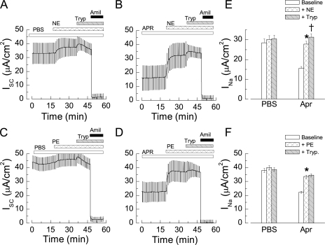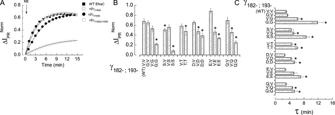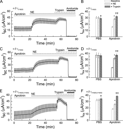 The epithelial Na(+) channel (ENaC) that mediates regulated Na(+) reabsorption by epithelial cells in the kidney and lungs can be activated by endogenous proteases such as channel activating protease 1 and exogenous proteases such as trypsin and neutrophil elastase (NE). The mechanism by which exogenous proteases activate the channel is unknown. To test the hypothesis that residues on ENaC mediate protease-dependent channel activation wild-type and mutant ENaC were stably expressed in the FRT epithelial cell line using a tripromoter human ENaC construct, and protease-induced short-circuit current activation was measured in aprotinin-treated cells. The amiloride-sensitive short circuit current (I(Na)) was stimulated by aldosterone (1.5-fold) and dexamethasone (8-fold). Dexamethasone-treated cells were used for all subsequent studies. The serum protease inhibitor aprotinin decreased baseline I(Na) by approximately 50% and I(Na) could be restored to baseline control values by the exogenous addition of trypsin, NE, and porcine pancreatic elastase (PE) but not by thrombin. All protease experiments were thus performed after exposure to aprotinin. Because NE recognition of substrates occurs with a preference for binding valines at the active site, several valines in the extracellular loops of alpha and gamma ENaC were sequentially substituted with glycines. This scan yielded two valine residues in gamma ENaC at positions 182 and 193 that resulted in inhibited responses to NE when simultaneously changed to other amino acids. The mutations resulted in decreased rates of activation and decreased activated steady-state current levels. There was an approximately 20-fold difference in activation efficiency of NE against wild-type ENaC compared to a mutant with glycine substitutions at positions 182 and 193. However, the mutants remain susceptible to activation by trypsin and the related elastase, PE. Alanine is the preferred P(1) position residue for PE and substitution of alanine 190 in the gamma subunit eliminated I(Na) activation by PE. Further, substitution with a novel thrombin consensus sequence (LVPRG) beginning at residue 186 in the gamma subunit (gamma(Th)) allowed for I(Na) activation by thrombin, whereas wild-type ENaC was unresponsive. MALDI-TOF mass spectrometric evaluation of proteolytic digests of a 23-mer peptide encompassing the identified residues (T(176)-S(198)) showed that hydrolysis occurred between residues V193 and M194 for NE and between A190 and S191 for PE. In vitro translation studies demonstrated thrombin cleaved the gamma(Th) but not the wild-type gamma subunit. These results demonstrate that gamma subunit valines 182 and 193 are critical for channel activation by NE, alanine 190 is critical for channel activation by PE, and that channel activation can be achieved by inserting a novel thrombin consensus sequence. These results support the conclusion that protease binding and perhaps cleavage of the gamma subunit results in ENaC activation.
