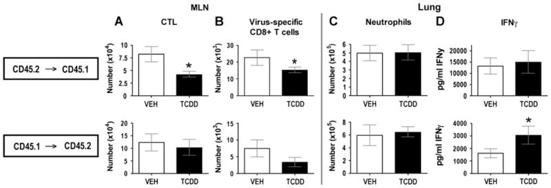 There is growing evidence that prenatal and early postnatal environmental factors influence the development and programming of the immune system, causing long-lasting negative health consequences. The aryl hydrocarbon receptor (AhR) is an important modulator of the development and function of the immune system; however, the mechanism is poorly understood. Exposure to the AhR agonist 2,3,7,8-tetrachlorodibenzo-p-dioxin throughout gestation and during lactation yields adult offspring with persistent defects in their immune response to influenza virus. These functional alterations include suppressed lymphocyte responses and increased inflammation in the infected lung despite normal cellularity and anatomical development of lymphoid organs. The studies presented here were conducted to determine the critical period during immune ontogeny that is particularly sensitive to inappropriate AhR activation. We also investigated the contribution of AhR-mediated events within and extrinsic to hematopoietic cells. Our findings show that AhR activation alters different elements of the immune system at different times during development by affecting different tissue targets. In particular, diminished T-cell responses arise due to deregulated events within bone marrow-derived cells. In contrast, increased interferon gamma levels in the infected lung result from AhR-regulated events extrinsic to bone marrow-derived cells, and require AhR agonist exposure during early gestation. The persistence of AhR activation induced immune modulation was also compared, revealing that AhR activation causes long-lasting functional alterations in the developing immune system, whereas the impact on the mature immune system is transient.