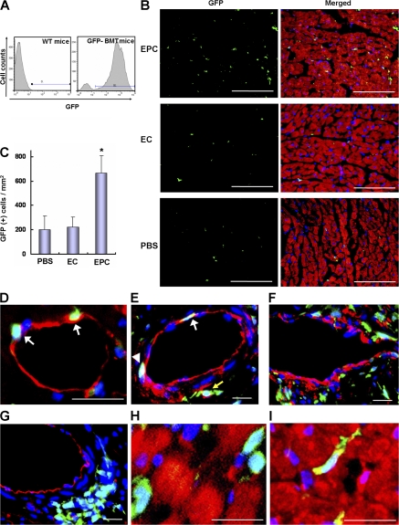 Noncellular differentiation effects have emerged as important mechanisms mediating therapeutic effects of stem or progenitor cell transplantation. Here, we investigated the expression patterns and sources of humoral factors and their regional and systemic biological effects after bone marrow (BM)-derived endothelial progenitor cell (EPC) transplantation into ischemic myocardium. Although most of the transplanted EPCs disappeared within a week, up-regulation of multiple humoral factors was sustained for longer than two weeks, which correlated well with the recovery of cardiac function. To determine the source of the humoral factors, we injected human EPCs into immunodeficient mice. Whereas the expression of human EPC (donor)-derived cytokines rapidly decreased to a nondetectable level within a week, up-regulation of mouse (recipient)-derived cytokines, including factors that could mobilize BM cells, was sustained. Histologically, we observed higher capillary density, a higher proliferation of myocardial cells, a lower cardiomyocyte apoptosis, and reduced infarct size. Furthermore, after EPC transplantation, BM-derived stem or progenitor cells were increased in the peripheral circulation and incorporated into the site of neovascularization and myocardial repair. These data indicate that myocardial EPC transplantation induces humoral effects, which are sustained by host tissues and play a crucial role in repairing myocardial injury.