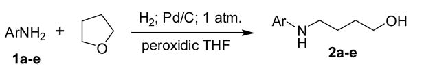 Reaction of primary aromatic amines with peroxidic tetrahydrofuran (THF) in the presence of hydrogen and 10% palladium on carbon catalyst results in THF ring opening to give 4-N-arylamino-1-butanols in good yield. The reaction mechanism is believed to involve a free-radical sequence resulting in an imino alcohol subsequently reduced to product.