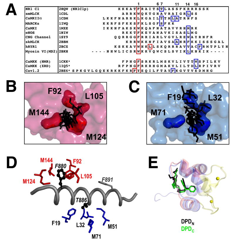 Calmodulin (CaM) regulates tetrameric N-methyl-D-aspartate receptors (NMDARs) by binding tightly to the C0 and C1 regions of its NR1 subunit. A crystal structure (2HQW; 1.96 A) of calcium-saturated CaM bound to NR1C1 (peptide spanning 875-898) showed that NR1 S890, whose phosphorylation regulates membrane localization, was solvent protected, whereas the endoplasmic reticulum retention motif was solvent exposed. NR1 F880 filled the CaM C-domain pocket, whereas T886 was closest to the N-domain pocket. This 1-7 pattern was most similar to that in the CaM-MARCKS complex. Comparison of CaM-ligand wrap-around conformations identified a core tetrad of CaM C-domain residues (FLMM(C)) that contacted all ligands consistently. An identical tetrad of N-domain residues (FLMM(N)) made variable sets of contacts with ligands. This CaM-NR1C1 structure provides a foundation for designing mutants to test the role of CaM in NR1 trafficking as well as insights into how the homologous CaM domains have different roles in molecular recognition.