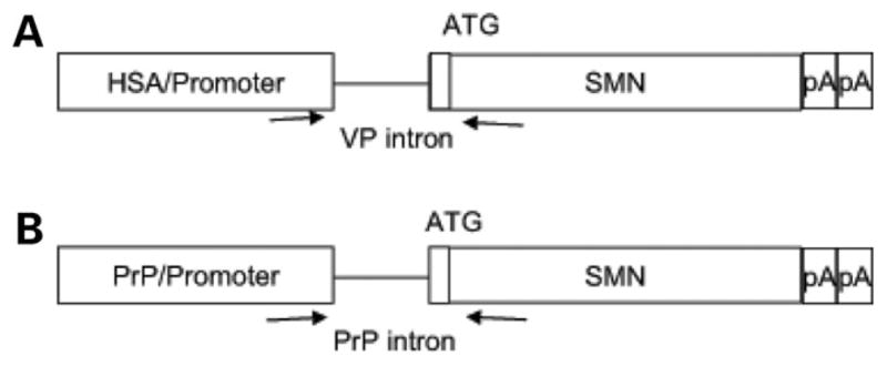Spinal muscular atrophy (SMA) is caused by loss of the survival motor neuron gene (SMN1) and retention of the SMN2 gene. The copy number of SMN2 affects the amount of SMN protein produced and the severity of the SMA phenotype. While loss of mouse Smn is embryonic lethal, two copies of SMN2 prevents this embryonic lethality resulting in a mouse with severe SMA that dies 5 days after birth. Here we show that expression of full-length SMN under the prion promoter (PrP) rescues severe SMA mice. The PrP results in high levels of SMN in neurons at embryonic day 15. Mice homozygous for PrP-SMN with two copies of SMN2 and lacking mouse Smn survive for an average of 210 days and lumbar motor neuron root counts in these mice were normal. Expression of SMN solely in skeletal muscle using the human skeletal actin (HSA) promoter resulted in no improvement of the SMA phenotype or extension of survival. One HSA line displaying nerve expression of SMN did affect the SMA phenotype with mice living for an average of 160 days. Thus, we conclude that expression of full-length SMN in neurons can correct the severe SMA phenotype in mice. Furthermore, a small increase of SMN in neurons has a substantial impact on survival of SMA mice while high SMN levels in mature skeletal muscle alone has no impact.