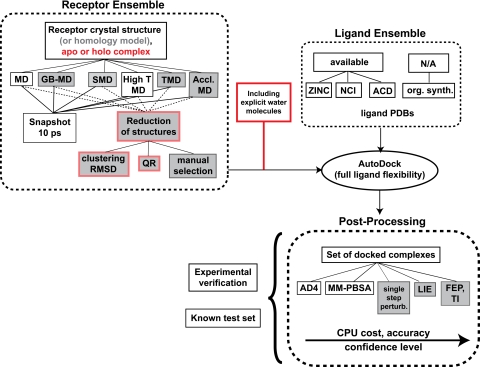 The interactions among associating (macro)molecules are dynamic, which adds to the complexity of molecular recognition. While ligand flexibility is well accounted for in computational drug design, the effective inclusion of receptor flexibility remains an important challenge. The relaxed complex scheme (RCS) is a promising computational methodology that combines the advantages of docking algorithms with dynamic structural information provided by molecular dynamics (MD) simulations, therefore explicitly accounting for the flexibility of both the receptor and the docked ligands. Here, we briefly review the RCS and discuss new extensions and improvements of this methodology in the context of ligand binding to two example targets: kinetoplastid RNA editing ligase 1 and the W191G cavity mutant of cytochrome c peroxidase. The RCS improvements include its extension to virtual screening, more rigorous characterization of local and global binding effects, and methods to improve its computational efficiency by reducing the receptor ensemble to a representative set of configurations. The choice of receptor ensemble, its influence on the predictive power of RCS, and the current limitations for an accurate treatment of the solvent contributions are also briefly discussed. Finally, we outline potential methodological improvements that we anticipate will assist future development.