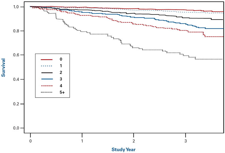 Results: Of 4229 respondents, 356 deaths occurred during 4 years of follow-up. Those with 1 complication did not have an increased risk of mortality, whereas those with 2 complications (hazard ratio [HR] = 1.90, 95% confidence interval [CI] = 1.27, 2.83), 3 complications (HR = 2.66, 95% CI = 1.77, 4.01), 4 complications (HR = 3.41, 95% CI = 2.18, 5.33), and >5 complications (HR = 7.18, 95% CI = 4.39, 11.74) had greater risk of death. Replacing the complications count with the DCSI showed a similar mortality risk. Each level of the continuous DCSI was associated with a 1.34-fold (95% CI = 1.28, 1.41) greater risk of death. Similar results were obtained for the association of the DCSI with risk of hospitalization. Comparison of receiver operating characteristic curves verified that the DCSI was a slightly better predictor of mortality than a count of complications (P < .0001).