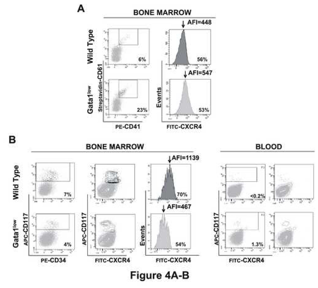 Conclusion: Similar abnormalities in the SDF-1/CXCR4 axis are observed in PMF patients and in the Gata1 low mice model of myelofibrosis. We suggest that these abnormalities contribute to the increased stem/progenitor cell trafficking observed in this mouse model as well as patients with PMF.