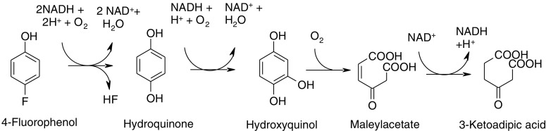 A Gram-positive bacterial strain capable of aerobic biodegradation of 4-fluorophenol (4-FP) as the sole source of carbon and energy was isolated by selective enrichment from soil samples collected near an industrial site. The organism, designated strain IF1, was identified as a member of the genus Arthrobacter on the basis of 16S ribosomal RNA gene sequence analysis. Arthrobacter strain IF1 was able to mineralize 4-FP up to concentrations of 5 mM in batch culture. Stoichiometric release of fluoride ions was observed, suggesting that there is no formation of halogenated dead-end products during 4-FP metabolism. The degradative pathway of 4-FP was investigated using enzyme assays and identification of intermediates by gas chromatography (GC), GC-mass spectrometry (MS), high-performance liquid chromatography, and liquid chromatography-MS. Cell-free extracts of 4-FP-grown cells contained no activity for catechol 1,2-dioxygenase or catechol 2,3-dioxygenase, which indicates that the pathway does not proceed through a catechol intermediate. Cells grown on 4-FP oxidized 4-FP, hydroquinone, and hydroxyquinol but not 4-fluorocatechol. During 4-FP metabolism, hydroquinone accumulated as a product. Hydroquinone could be converted to hydroxyquinol, which was further transformed into maleylacetic acid and beta-ketoadipic acid. These results indicate that the biodegradation of 4-FP starts with a 4-FP monooxygenase reaction that yields benzoquinone, which is reduced to hydroquinone and further metabolized via the beta-ketoadipic acid pathway.