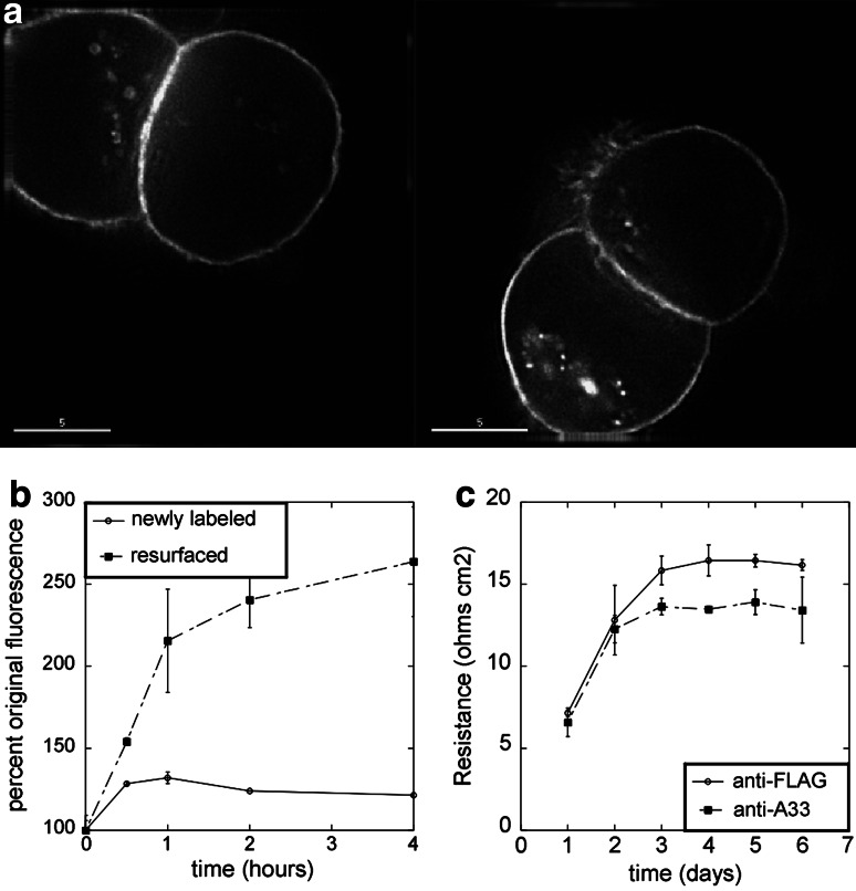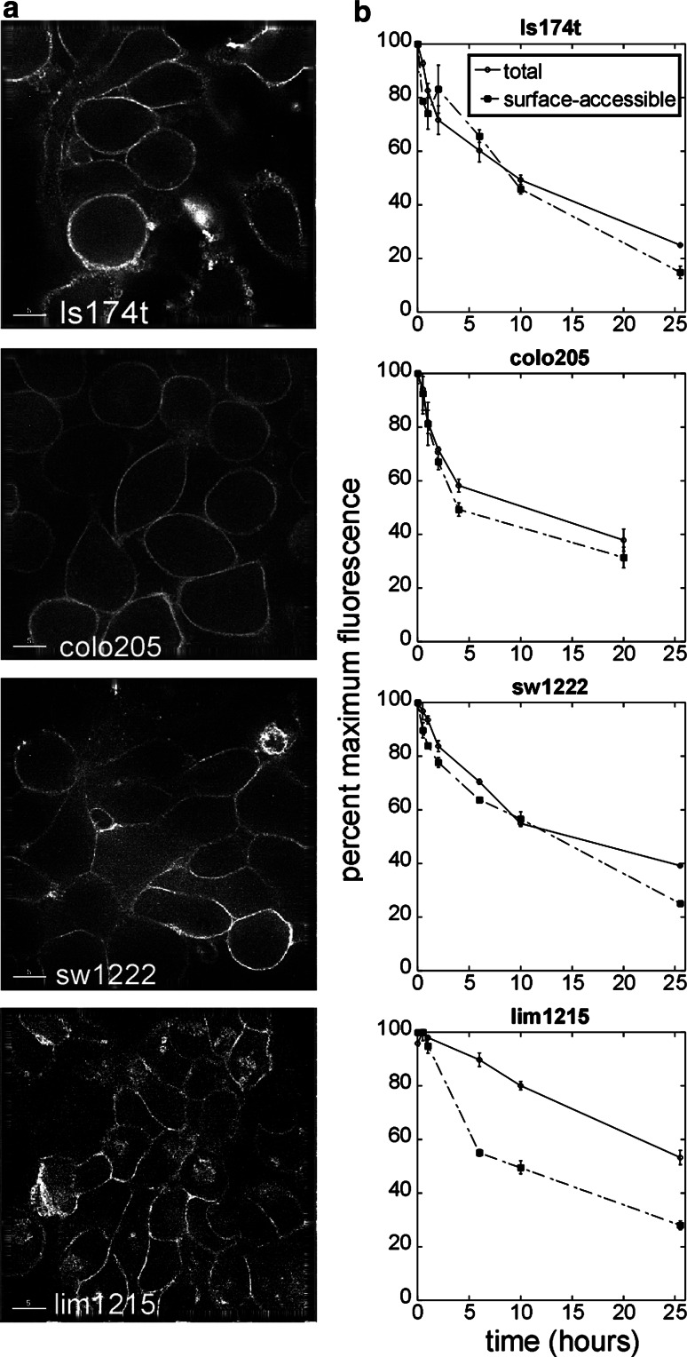The A33 antigen is a cell surface glycoprotein of the small intestine and colonic epithelium with homology to tight junction-associated proteins of the immunoglobulin superfamily, including CAR and JAM. Its restricted tissue localization and high level of expression have led to its use as a target in colon cancer immunotherapy. Although the antigen is also present in normal intestine, radiolabeled antibodies against A33 are selectively retained by tumors in the gut as well as in metastatic lesions for as long as 6 weeks. Accordingly, we have studied the trafficking and kinetic properties of the antigen to determine its promise in two-step, pretargeted therapies. The localization, mobility, and persistence of the antigen were investigated, and this work has demonstrated that the antigen is both highly immobile and extremely persistent-retaining its surface localization for a turnover halflife of greater than 2 days. In order to explain these unusual properties, we explored the possibility that A33 is a component of the tight junction. The simple property of surface persistence, described here, may contribute to the prolonged retention of the clinically administered antibodies, and their uncommon ability to penetrate solid tumors.
