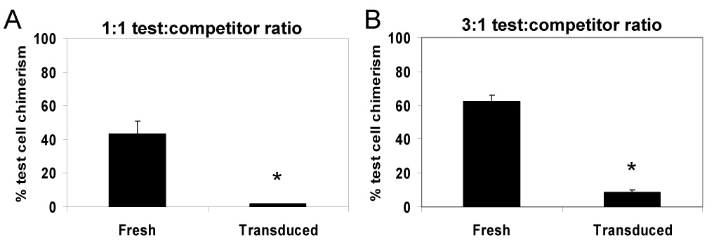 Transduced lin marrow cells display significantly impaired competitive repopulating ability in 1100 cGy-conditioned hosts. Transduced lin test cells from Bl/6 donors were mixed with freshly-isolated lin competitor cells from Boy J donors, and the mixtures were transplanted into 1100 cGy-conditioned Boy J hosts. In the experiment shown in panel (A), 3 × 105 test cells were mixed with 3 × 105 competitor cells prior to transplantation; in the experiment shown in panel (B), 6 × 105 test cells were mixed with 2 × 105 competitor cells. Test cell chimerism is shown 4–5 months post-transplant from two independent experiments. N = 4 hosts for each parameter. *, P < 0.012 comparing fresh test cell chimerism to that of transduced test cells.