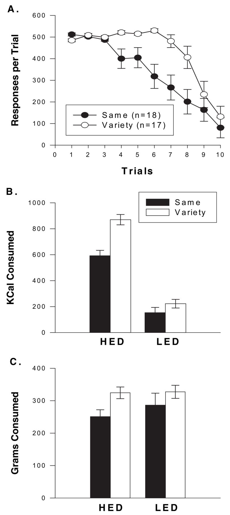 Results: Participants in the same groups habituated faster than those in the variety groups (p = .05), and in Experiment 2, the effect of variety was independent of energy density. Participants in the variety groups also consumed more energy than those in the same groups in both experiments (p = .05).