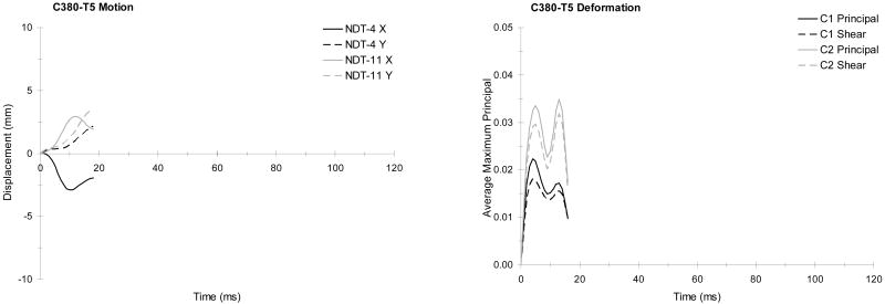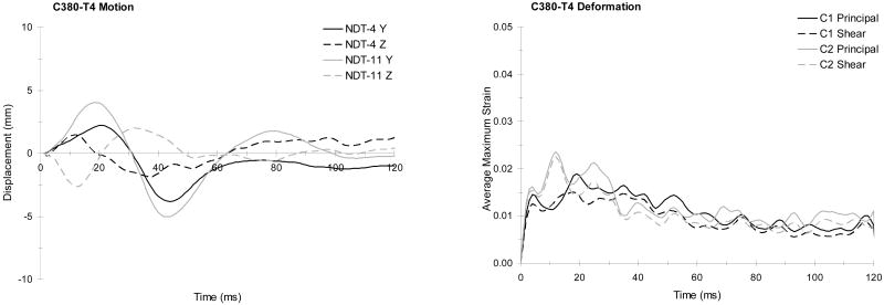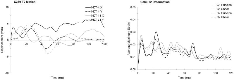 High-speed biplane x-ray and neutral density targets were used to examine brain displacement and deformation during impact. Relative motion, maximum principal strain, maximum shear strain, and intracranial pressure were measured in thirty-five impacts using eight human cadaver head and neck specimens. The effect of a helmet was evaluated. During impact, local brain tissue tends to keep its position and shape with respect to the inertial frame, resulting in relative motion between the brain and skull and deformation of the brain. The local brain motions tend to follow looping patterns. Similar patterns are observed for impact in different planes, with some degree of posterior-anterior and right-left symmetry. Peak coup pressure and pressure rate increase with increasing linear acceleration, but coup pressure pulse duration decreases. Peak average maximum principal strain and maximum shear are on the order of 0.09 for CFC 60 Hz data for these tests. Peak average maximum principal strain and maximum shear decrease with increasing linear acceleration, coup pressure, and coup pressure rate. Linear and angular acceleration of the head are reduced with use of a helmet, but strain increases. These results can be used for the validation of finite element models of the human head.