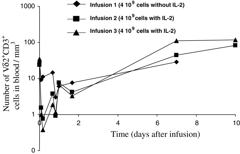 Experimental design: A 1-h intravenous infusion of gamma9delta2 T lymphocytes was administered alone during treatment cycle 1 and combined with a low dose of subcutaneous interleukin-2 (IL-2, 2 MIU/m2 from Day 1 to Day 7) in the two subsequent cycles (at 3-week intervals). The dose of gamma9delta2 T lymphocytes was escalated from 1 up to 8 x 10(9) cells.
