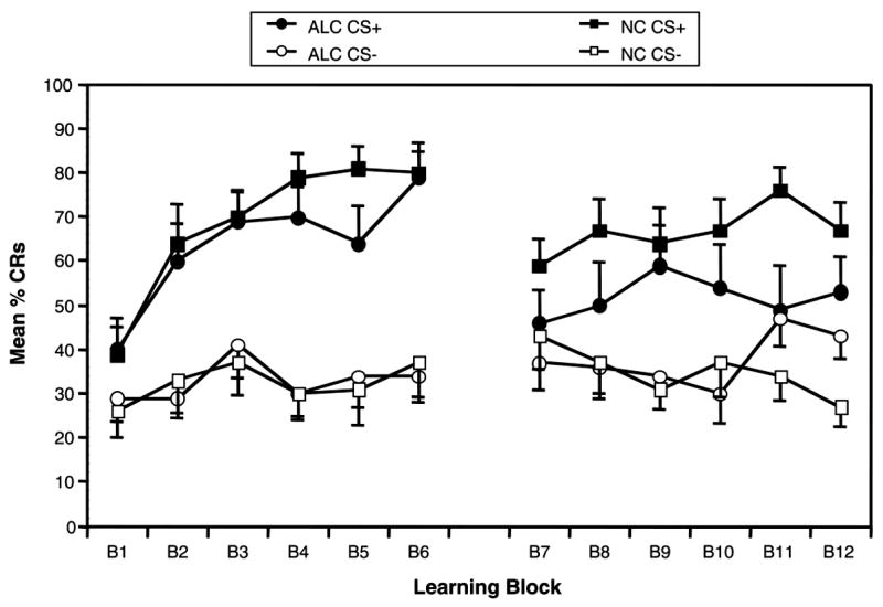 Evidence has shown that alcoholism leads to volume reductions in brain regions critical for associative learning using the eyeblink classical conditioning paradigm (EBCC). Evidence indicates that cerebellar shrinkage causes impairment in simple forms of EBCC, whereas changes in forebrain structures result in impairment in more complex tasks. In this study, the ability of abstinent alcoholics and matched control participants to acquire learned responses during delay discrimination and discrimination reversal was examined and related to severity of drinking history and neuropsychological performance. During discrimination learning, one tone (CS+) predicted the occurrence of an airpuff (unconditioned stimulus), and another tone (CS-) served as a neutral stimulus; then the significance of the tones was reversed. Alcoholics who learned the initial discrimination were impaired in acquiring the new CS+ after the tones reversed; this is a function that has previously been linked to forebrain structures. It is suggested that a factor important to alcoholic addiction may be the presence of alcoholic-related associative responses that interfere with the ability to learn new more adaptive associations.