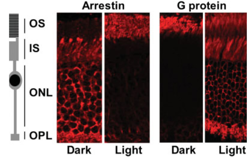 Many signaling proteins change their location within cells in response to external stimuli. In photoreceptors, this phenomenon is remarkably robust. The G protein of rod photoreceptors and rod transducin concentrates in the outer segments (OS) of these neurons in darkness. Within approximately 30 minutes after illumination, rod transducin redistributes throughout all of the outer and inner compartments of the cell. Visual arrestin concurrently relocalises from the inner compartments to become sequestered primarily within the OS. In the past several years, the question of whether these proteins are actively moved by molecular motors or whether they are redistributed by simple diffusion has been extensively debated. This review focuses on the most essential works in the area and concludes that the basic principle driving this protein movement is diffusion. The directionality and light dependence of this movement is achieved by the interactions of arrestin and transducin with their spatially restricted binding partners.