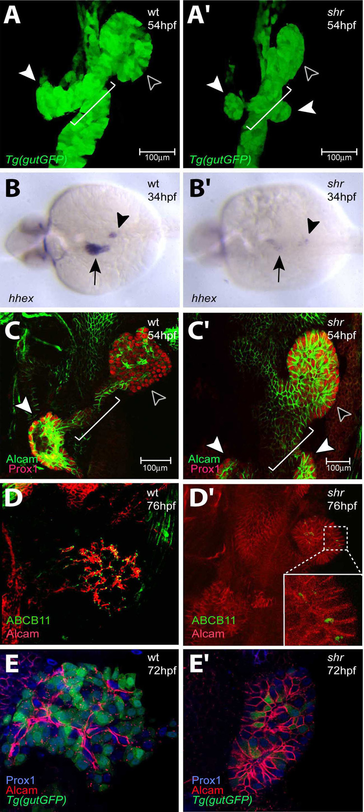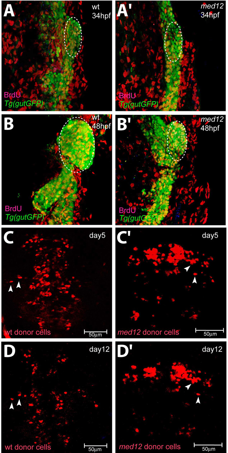 In zebrafish, the endoderm originates at the blastula stage from the most marginal blastomeres. Through a series of complex morphogenetic movements and differentiation events, the endodermal germ layer gives rise to the epithelial lining of the digestive tract as well as its associated organs such as the liver, pancreas, and swim bladder. How endodermal cells differentiate into distinct cell types such as hepatocytes or endocrine and exocrine pancreatic cells remains a major question. In a forward genetic screen for genes regulating endodermal organ development, we identified mutations at the shiri locus that cause defects in the development of a number of endodermal organs including the liver and pancreas. Detailed phenotypic analyses indicate that these defects are partially due to a reduction in endodermal expression of the hairy/enhancer of split-related gene, her5, at mid to late gastrulation stages. Using the Tg(0.7her5:EGFP)(ne2067) line, we show that her5 is expressed in the endodermal precursors that populate the pharyngeal region as well as the organ-forming region. We also find that knocking down her5 recapitulates some of the endodermal phenotypes of shiri mutants, further revealing the role of her5 in endoderm development. Positional cloning reveals that shiri encodes Med12, a regulatory subunit of the transcriptional Mediator complex recently associated with two human syndromes. Additional studies indicate that Med12 modulates the ability of Casanova/Sox32 to induce sox17 expression. Thus, detailed phenotypic analyses of embryos defective in a component of the Mediator complex have revealed new insights into discrete aspects of vertebrate endoderm development, and provide possible explanations for the craniofacial and digestive system defects observed in humans with mutations in MED12.